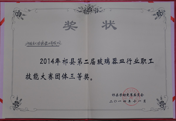 2014年被“中國日用玻璃協會授予高腳帝王杯、公爵杯榮譽稱號”